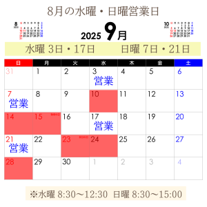 TOP > お知らせ・ブログ > お知らせ・最新情報 > 9月営業日・時間のお知らせ 2025.09.17 お知らせ・最新情報 9月営業日・時間のお知らせ 9月営業日時間のお知らせ今月の営業日・時間をお知らせいたします。今月の残りの日曜日の営業日は【21日】となっております。詳細はカレンダーをご覧ください。 前へ 一覧へ戻る 次へ カテゴリー お知らせ お知らせ・最新情報 よくある質問 首・肩の症状 腰の症状 膝・足の症状 姿勢について マトリクスウェーブについて 膝の痛み 足首の痛み その他 全てを見る アーカイブ 2025年9月 2025年8月